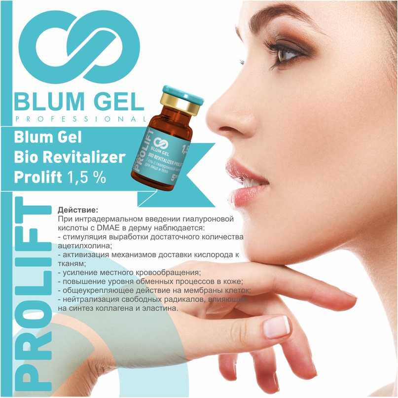 Состав содержит оптимальное соотношение ГК (15 мг/мл) и ДМАЭ (диметиламиноэтанола). Его роль в организме человека уникальна, он стимулирует синтез веществ, которые отвечают за тонус и эластичность кожи, четкость овала лица, подтянутость тканей. С возрастом их содержание катастрофически падает, поэтому формы теряют упругость. ДМАЭ, содержащийся в биоревитализанте BLUM GEL PROLIFT 1,5%, запускает их производство, обманывая