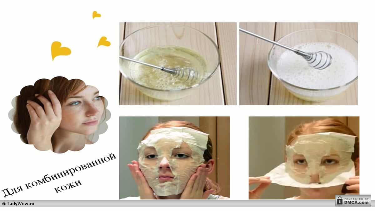 Эта маска также пользуется большой популярностью. Для жирной кожи нужно использовать куриный белок и крахмал. Сначала крахмал разводят небольшим количеством тёплой воды до текстуры густой сметаны. Потом в эту смесь добавляют взбитый куриный белок. Маску держать на коже 15 минут.
