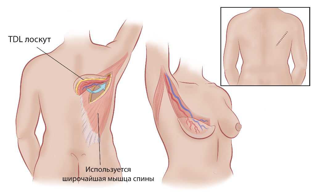В этом случае задействована широчайшая мышца спины. Лоскут через подкожный тоннель проводится в область отсутствующей груди.