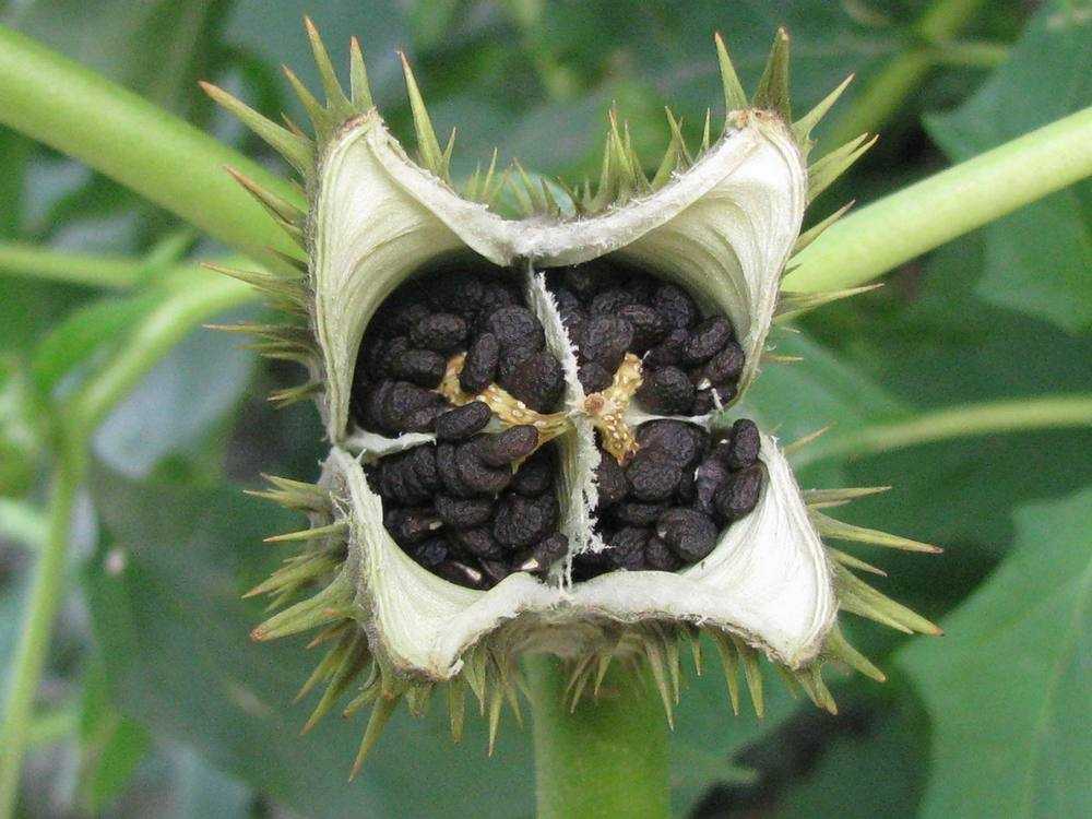 Плоды дурмана – круглые коробочки с семенами, покрытые шипами и разделенные на 4 отсека внутри. Из зернышек и травы получают эфирное масло. Созревают плоды в середине осени. Семена и цветы – особо ядовитые части растения.