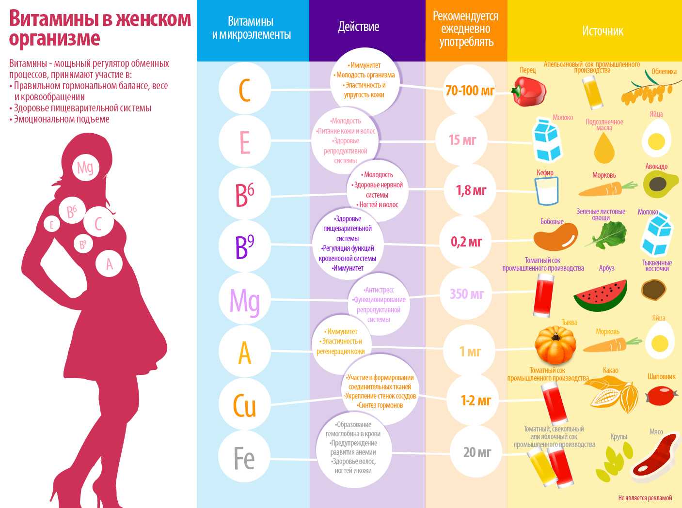 Также не следует забывать о железе, в нем женский организм нуждается постоянно из-за ежемесячных изменений. Железо играет важную роль в процессе кроветворения и является необходимым элементов для здоровья волос, ногтей, кожи, нервной системы и обеспечения клеточного дыхания.