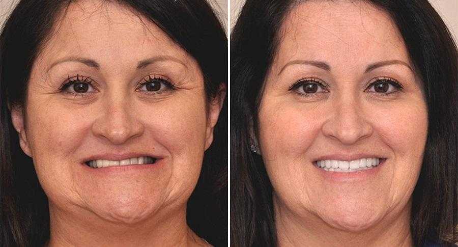 Вот пример того, как выглядит «возрастная» улыбка со сниженной высотой коронок, и какого результата можно достичь после лечения.