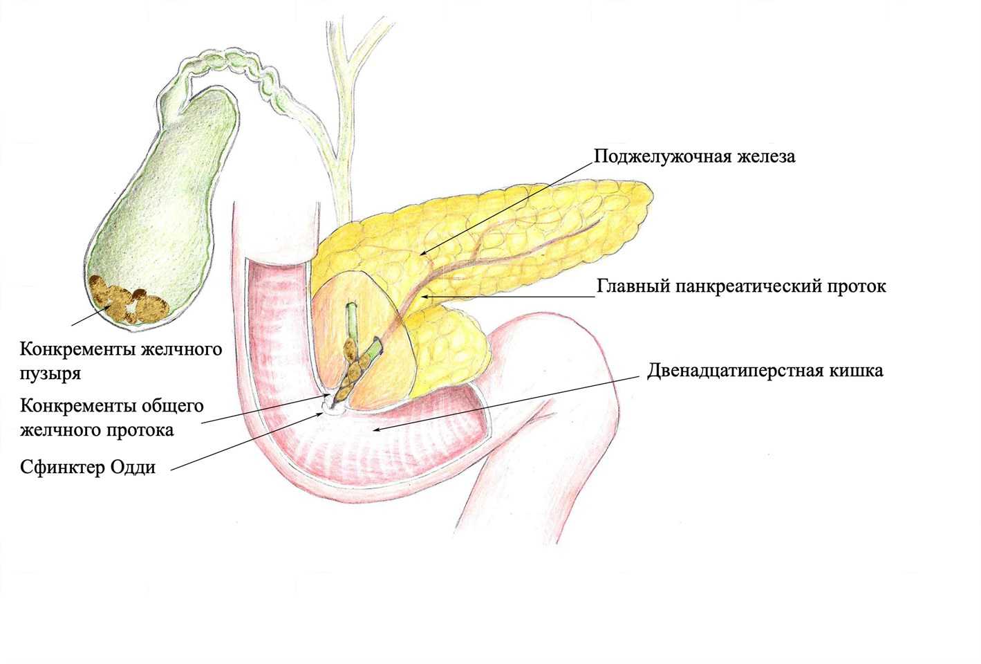 Холедохолитиаз и острый билиарный панкреатит. Холедохолитиаз развивается в результате миграции билиарного сладжа или мелких конкрементов из жёлчного пузыря в общий жёлчный проток. Попадая в холедох, мелкие конкременты беспрепятственно спускаются до сфинктера Одди, который представляет собой выпускной механизм — циркулярную мышечную манжету. Сладж и конкременты «вклиниваются» в сфинктер, вызывая его длительный спазм, вызывая нарушение оттока жёлчи — механическую желтуху. Кожные покровы, склеры пациента становятся насыщенного желтого цвета. Это состояние требует экстренной декомпрессии жёлчных путей – восстановления оттока жёлчи.