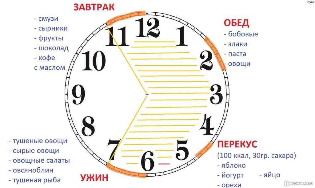 Схема 14/10 или 12/12. Привычные приёмы пищи, исключающие плотный ужин перед сном.
