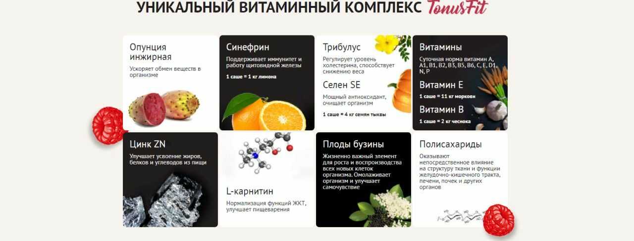 - листья земляники и пектин из цитрусов – улучшение микрофлоры кишечника и органов пищеварения, восстановление обмена веществ, нейтрализация всасывания жиров из пищи;