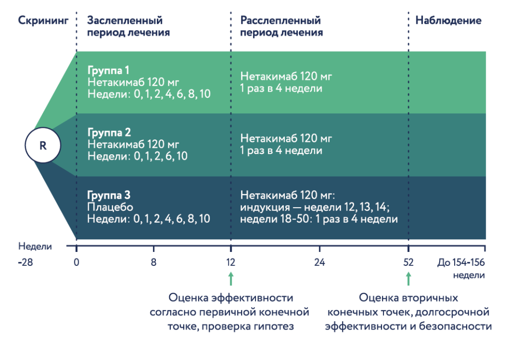 Лечение: по окончании двойного слепого периода после оценки эффективности на 12 неделе все пациенты из групп нетакимаба переводились на режим 1 раз в 4 недели. Пациенты из группы плацебо получали индукционную дозу нетакимаба 120 мг на неделях 12,13,14 с последующим переходом на режим 1 раз в 4 недели.