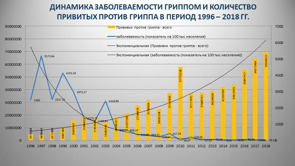Рисунок 4. Заболеваемость гриппом и количество привитых против гриппа в России за 1996–2018 годы