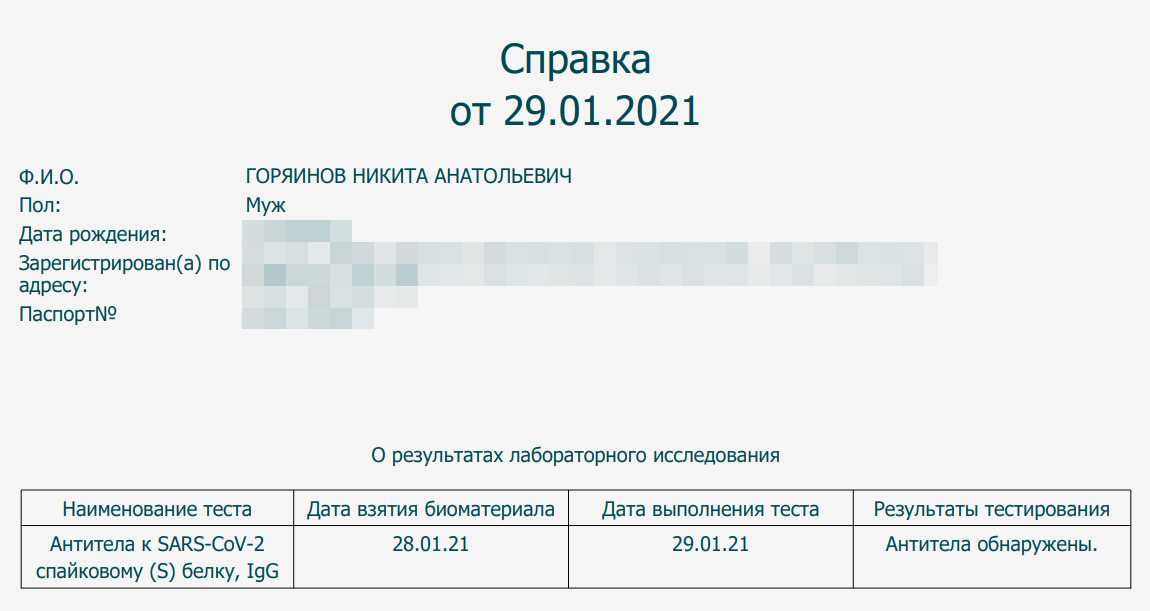 Платный анализ сдал 28 января, через 17 дней после первой прививки. Он прошёл без неприятных последствий, вторая рука в порядке. Спустя день, 29 января, были готовы результаты. Кстати, платные клиники, в отличие от государственных, дублируют анализы на английском языке, что окажется полезным во время путешествий.