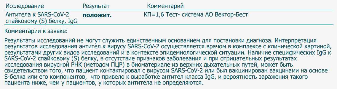Анализ на антитела к спайковому (S) белку показал их наличие: 1.6, когда положительный ответ даётся при значениях выше единицы. То есть вакцина работает, и уже на первом уколе выполнила свою ключевую задачу.