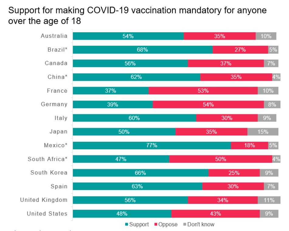 - обязательная вакцинации против COVID-19 поддерживается абсолютным большинством в девяти странах (Мексика, Бразилия, Южная Корея, Испания, Китай, Италия, Канада, Великобритания и Австралия);