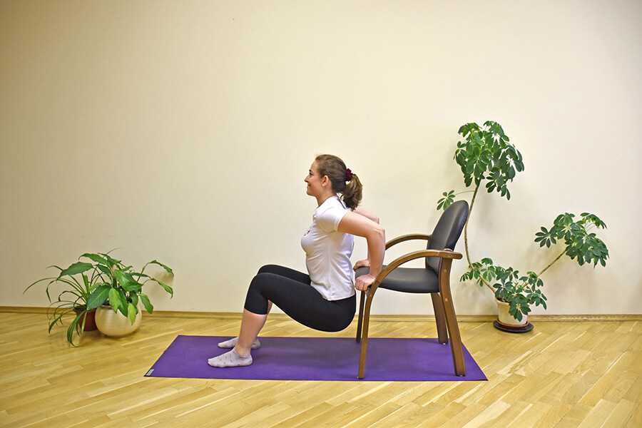 Обопритесь руками о сиденье стула и зафиксируйте ноги примерно в полуметре от стула. Сгибайте руки в локтях, опуская при этом бедра, затем выпрямите руки. Выполняйте это упражнение 10–15 раз (или более), делая перерывы по 30–60 секунд и повторяя цикл до 5 раз. Это упражнение укрепляет трицепсы.