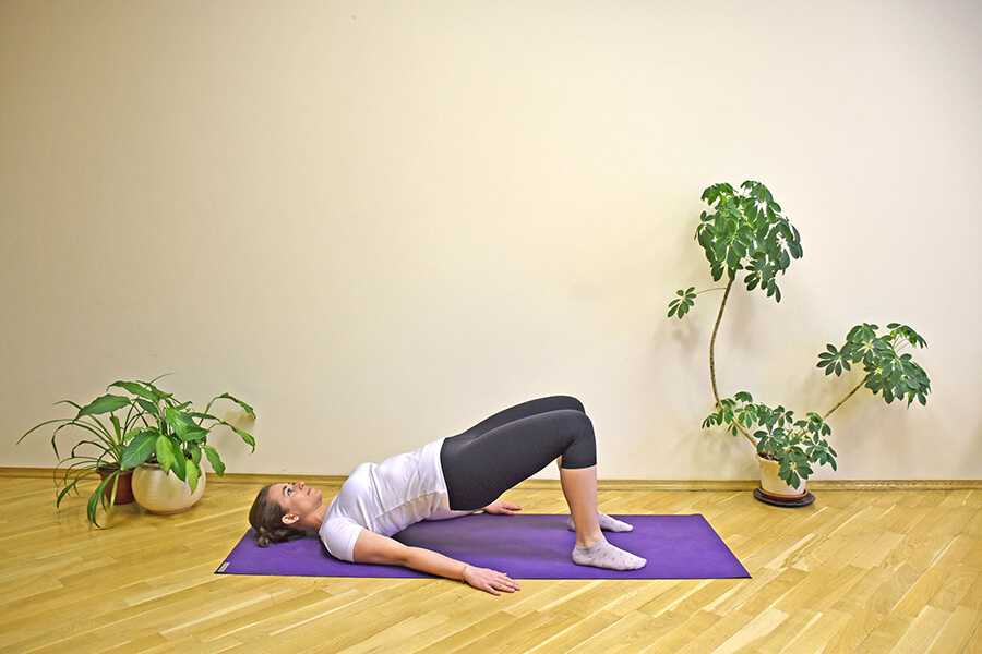 Примите исходное положение, прижав стопы к полу и зафиксировав колени над пятками. Поднимите бедра на комфортную для вас высоту и медленно опустите. Выполняйте это упражнение 10–15 раз (или более), делая перерывы по 30–60 секунд и повторяя цикл до 5 раз. Это упражнение укрепляет ягодицы.