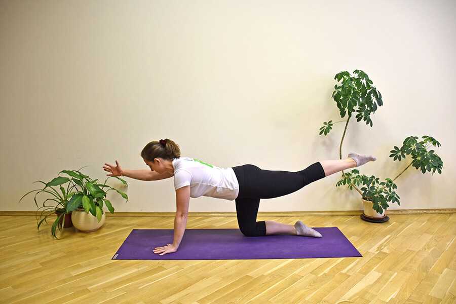 Примите исходное положение, когда руки находятся под плечами, а колени под бедрами. Поочередно тяните руку вперед, одновременно поднимая разноименную ногу. Выполняйте это упражнение 20–30 раз (или более), делая перерывы по 30–60 секунд и повторяя цикл до 5 раз. Это упражнение укрепляет мышцы живота, ягодиц и спины.