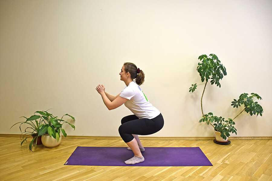 Поставьте ноги на ширине бедер. Стопы слегка направлены в сторону. Согните колени настолько, насколько вам удобно, плотно прижимая пятки и удерживая колени над стопами (не уводя их вперед). Сделайте присед и выпрямитесь. Выполняйте это упражнение 10–15 раз (или более), делая перерывы по 30–60 секунд и повторяя цикл до 5 раз. Это упражнение укрепляет мышцы ног и ягодиц.