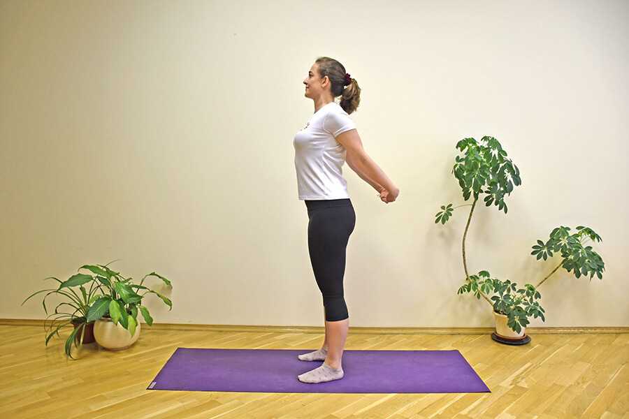 Сложите пальцы рук в замок за спиной. Потяните руки, вытянув при этом грудь вперед. Задержитесь в этом положении в течение 20–30 секунд (или более). Удержание этого положения способствует растяжению мышц груди и плеч.