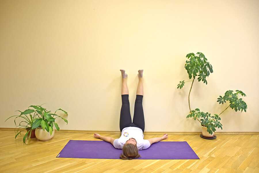 Зафиксируйте бедра на расстоянии 5–10 см от стены и дайте ногам отдохнуть. Закройте глаза, расслабьтесь и постепенно переходите на глубокое дыхание. Сконцентрируйтесь на своем дыхании, стараясь отбросить все мысли и не сосредотачиваясь на проблемах. Оставайтесь в этом положении до 5 минут. Удержание этого положения должно принести комфорт, способствовать расслаблению и снятию стресса.