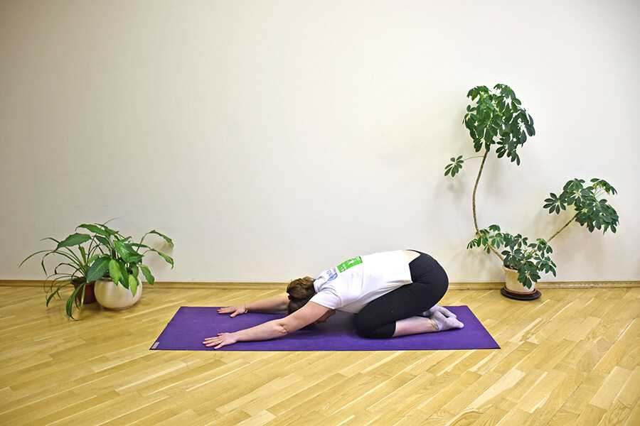 Примите положение сидя на пятках. Стремитесь опуститься животом к передней поверхности бедер, активно вытягивая руки вперед. Дышите в обычном темпе. Задержитесь в этом положении в течение 20–30 секунд (или более). Удержание этого положения способствует растяжению мышц спины, плеч и боков.
