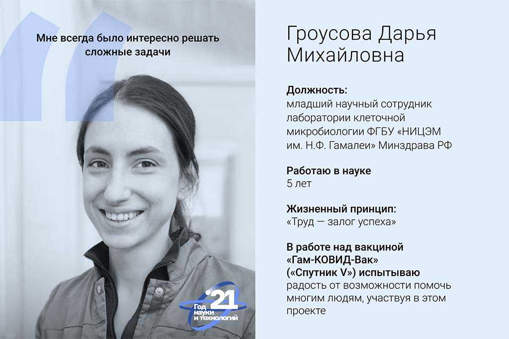 «Никогда не знаешь, что тебя ждет в будущем, как было и с этой пандемией. Так что, думаю, работа в этой области позволит создать вакцины и от других серьезных заболеваний, а самое главное — своевременно их внедрить», — говорит Гроусова.